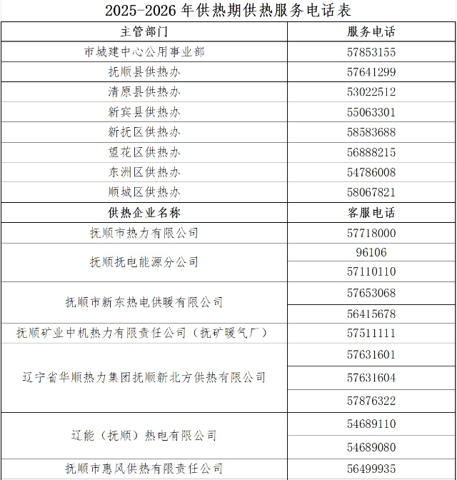 全市供热企业服务热线已全面启用,如您在供热期间遇到任何供热问题,均可随时拨打所属供热企业24小时服务热线,或通过市、区供热主管部门服务监督电话反映,我们将第一时间协调处理,全力保障您的用热权益。