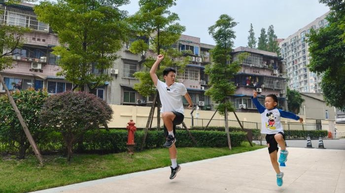 在成都某小区空地上,上门体育教练张意带着小学员训练。陈选斌 摄