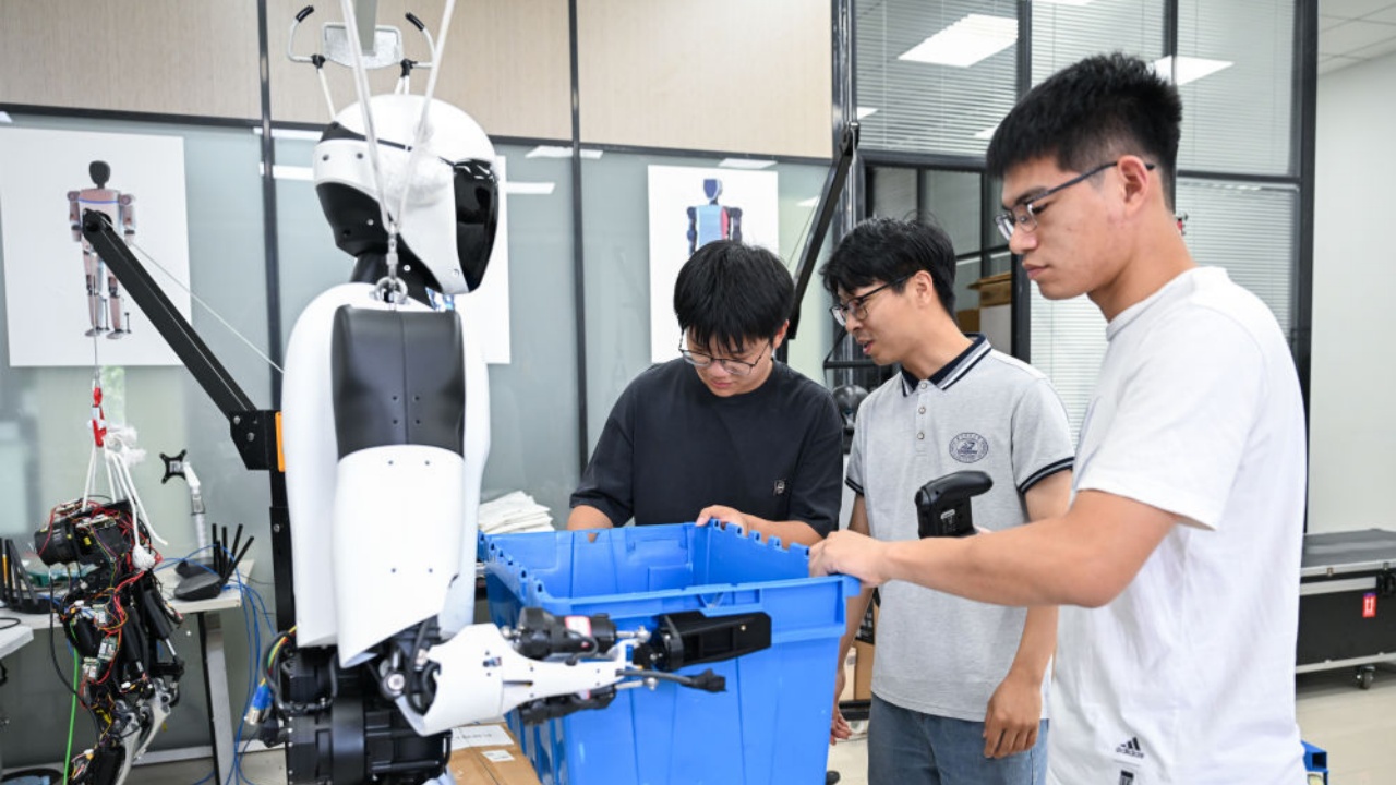 2025年5月29日,华中科技大学机械科学与工程学院,学生对“荆楚”人形机器人进行搬运测试。新华社记者 杜子璇 摄