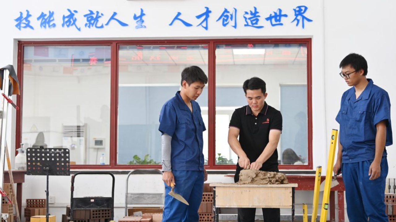 2025年9月9日,天津铁道职业技术学院砌筑集训基地,老师指导学生实践。新华社记者 李然 摄