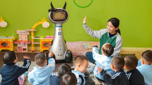 2025年11月4日,在山东省乐陵市天和嘉园幼儿园,老师带托育班的小朋友和机器人做互动。新华社发(贾鹏 摄)