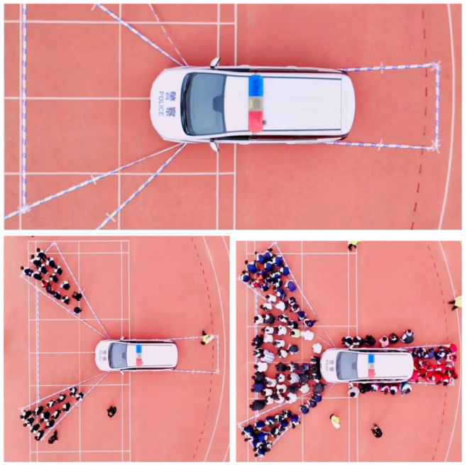操场上,一辆真实的警用车辆静静停放,四周用醒目的黄色标线勾勒出一个扇形区域——这正是驾驶员的“视觉盲区”。