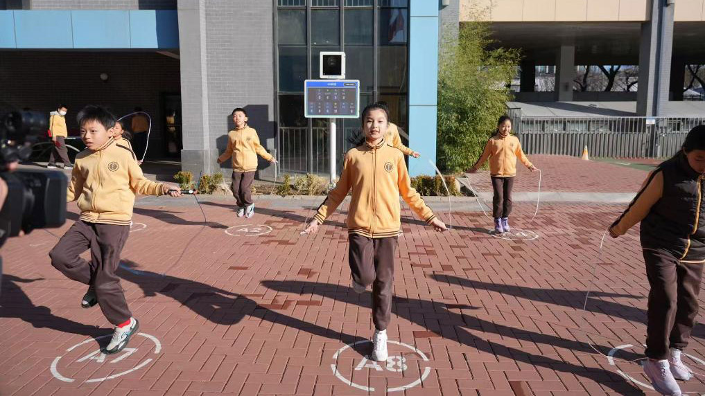 在北京第二实验小学,学生们正在使用智慧跳绳设备进行锻炼。新华社记者 谢晗 摄