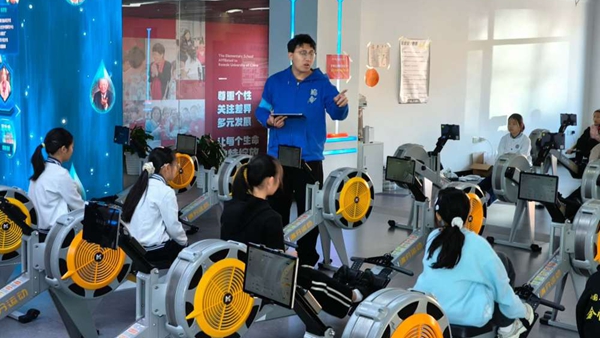在人民大学附属小学,这是如今已习以为常的场景:操场上阳光正好,塑胶跑道上,学生们雀跃地等待着老师的口令;一旁教学楼的“满分AI(人工智能)运动馆”里,划船机整齐排列,屏幕闪烁,孩子们边听老师讲解、边关注着自己的实时数据。