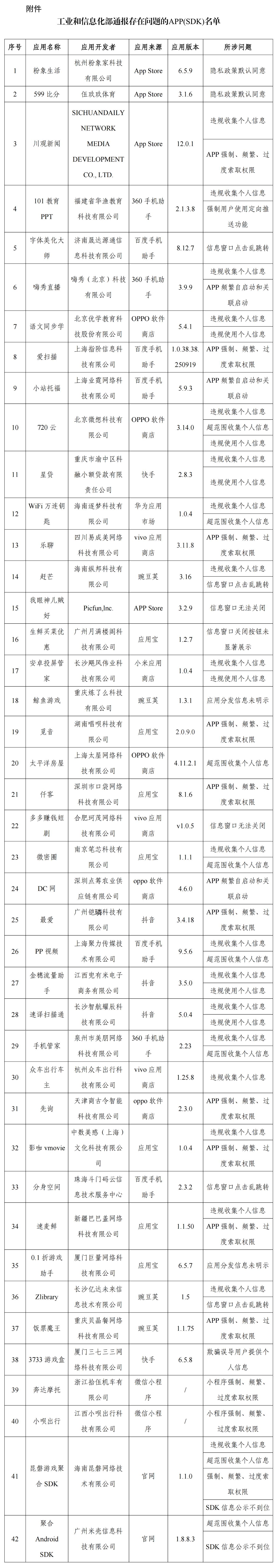 根据中央网信办、工业和信息化部、公安部、市场监管总局等四部门联合发布的《关于开展2025年个人信息保护系列专项行动的公告》,依据《个人信息保护法》《网络安全法》《电信条例》《电信和互联网用户个人信息保护规定》等法律法规,我部对APP、SDK违法违规收集使用个人信息等问题开展治理。近期,经组织第三方检测机构进行抽查,共发现42款APP及SDK存在侵害用户权益行为(详见附件),现予以通报。