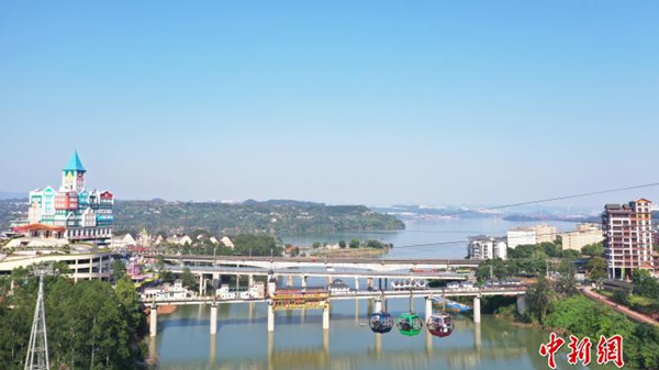 初冬时节,暖阳高照。三峡水库175米蓄水后,长江重庆涪陵红酒小镇段出现高峡平湖美景。小镇依托独特的平湖资源,打造了近10公里索道环线“移动观景台”,游客乘索道缓缓升空,可全方位俯瞰山水相依的独特景致。图为沿江小镇现高峡平湖美景。冉桐 摄