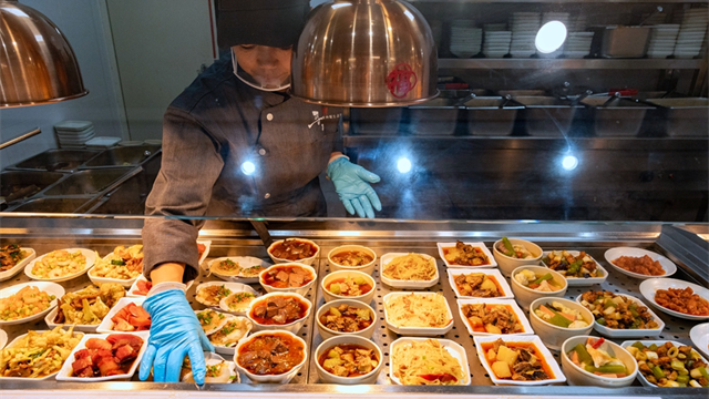 2025年11月18日,四川博物院食堂工作人员布置小碗菜。