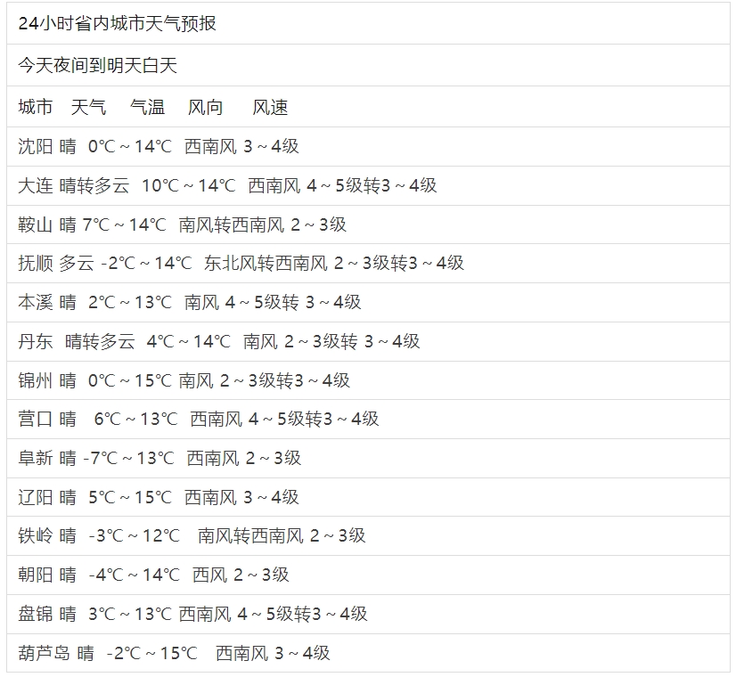 【气温】明天全省最高气温仍在12~15℃之间,白天体感的感觉跟今天一样非常的暖和。早间也不冷,大连能达到10℃,其他城市在0~7℃之间,只有抚顺、阜新、铁岭、葫芦岛在零度以下,阜新最冷,-7℃。