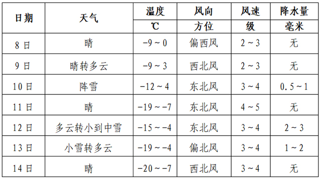 抚顺市气象局预计未来一周(12月8日至12月14日)天气预报:我市10日阵雪、12日夜间至13日白天中雪,其他时间以晴或多云天气为主;周平均降水量3~6毫米,较历年同期(3.0毫米)偏多;周平均气温-10~-9℃,较历年同期(-10.2℃)偏高,极端最低气温-21~-20℃,极端最高气温3~4℃。