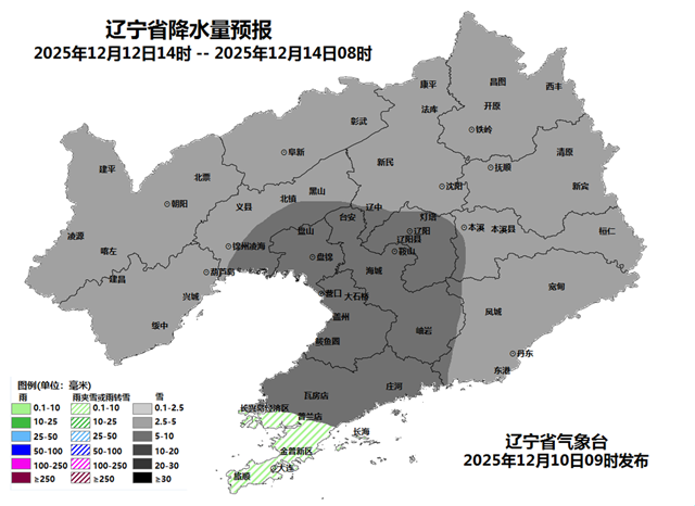 12月10日,辽宁省气象台发布气象信息专报,预计12月12日至13日我省将出现一次降雪、寒潮、大风天气过程。全省大部分地区有中雪(2.5~5毫米),南部地区有大雪(5~8毫米);雪后将出现寒潮大风天气,全省气温将下降4~12℃,14日的早晨气温达到最低,中西部地区最低气温为-19~-15℃,局部可达-25~-20℃;13日午后到夜间海区最大阵风可达8~9级。需防范降雪、寒潮、大风天气对交通出行、海上安全、设施农业、能源供应、人体健康等的不利影响。