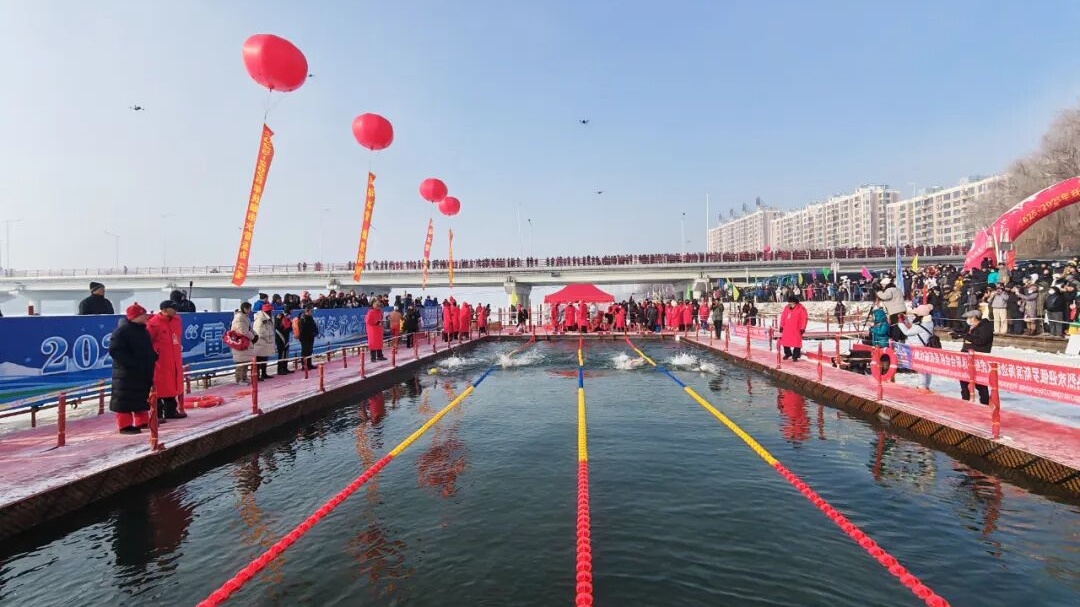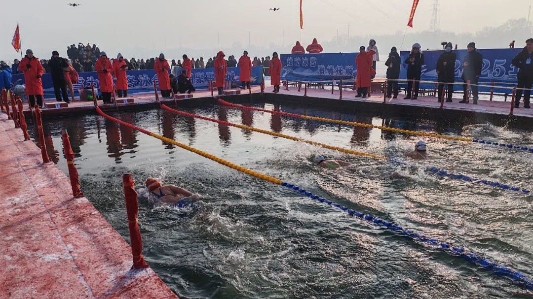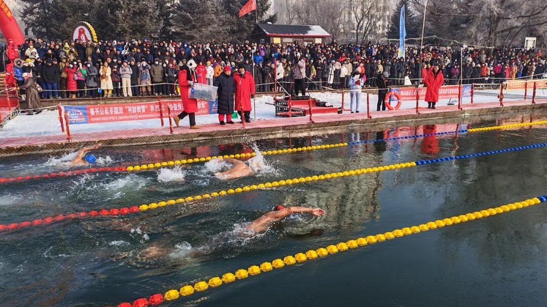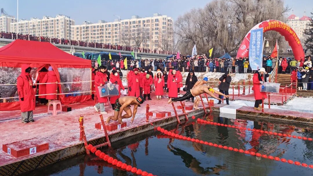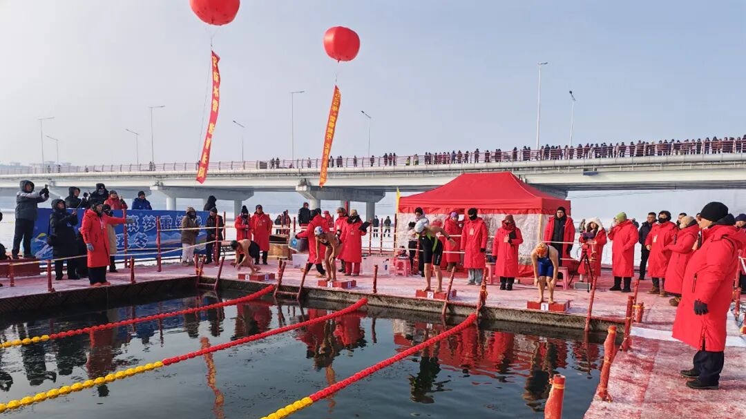 比赛现场,随着发令枪响,运动员们纵身跃入冰河展开激烈竞技,享受极限运动带来的乐趣。岸边,围观市民热情为冬泳健儿加油助威。