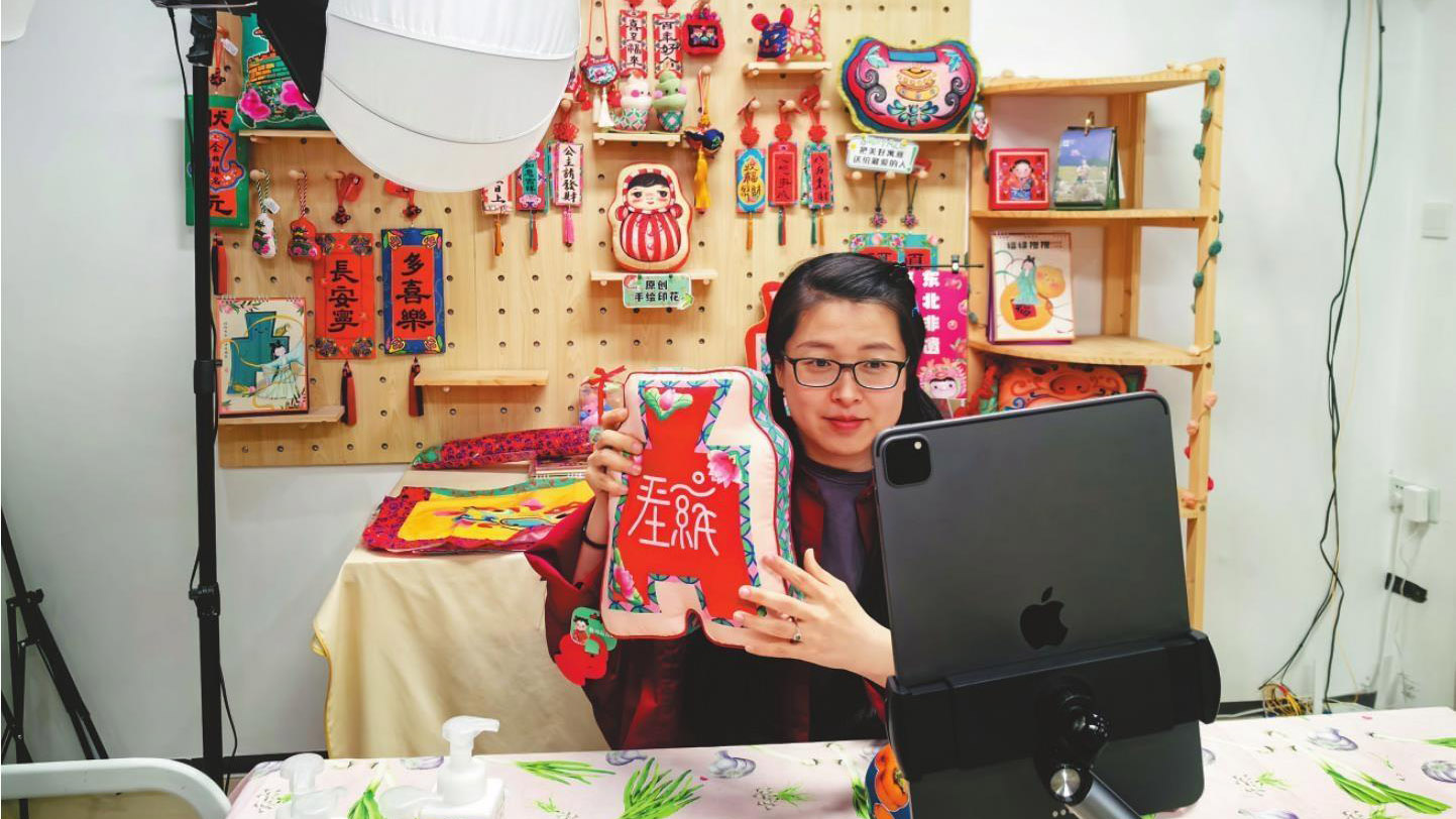 庞渤洋在直播推介东北布艺手作。 记者 严佩鑫 摄