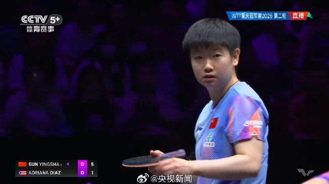 13日,在2026年WTT重庆冠军赛女单1/8决赛中,孙颖莎3比0战胜波多黎各选手迪亚兹,晋级八强。继续加油!