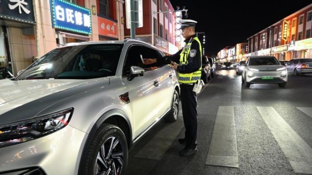内蒙古呼和浩特,交警夜查违停车辆。