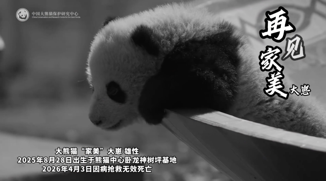 据“中国大熊猫保护研究中心”微信公众号消息,大熊猫“家美”大崽,雄性,2025年8月28日出生于熊猫中心卧龙神树坪基地,2026年4月3日因病抢救无效死亡。
