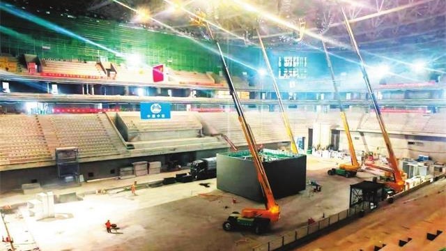 图为沈阳王家湾冰上运动中心综合馆内部施工现场。