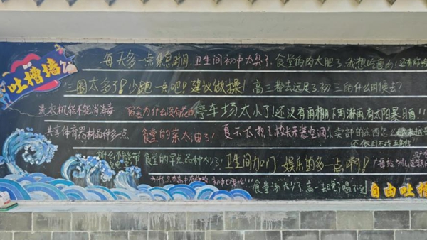 墙上的留言五花八门:有女生吐槽宿舍没有吹风机,洗澡后头发干得慢;有同学吐槽洗完衣服后,晾晒的地方不够;有的吐槽课业压力大,想多放假;还有的吐槽打饭等待时间长、汤里没菜、小卖部比县城超市贵、电动车停放处没有雨棚、厕所隔间没有门、淋浴间想装花洒……