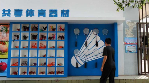 共享器材架也立起来了。操场边、球场旁竖着不少铁架子,分格摆放着篮球、羽毛球拍、乒乓球拍、跳绳、沙包,同学们自助取用,用完归还。