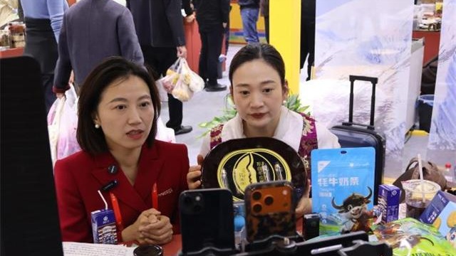 西藏馆的工作人员正在直播介绍商品。