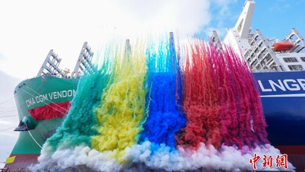 第三艘全球最大24000TEU级LNG双燃料集装箱船提前8个半月交付。沪东中华造船(集团)有限公司供图
