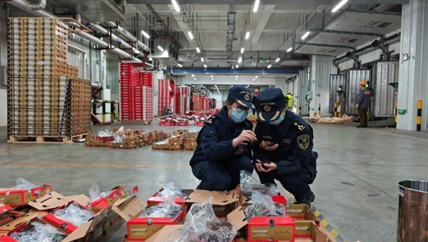 广州海关所属南沙海关关员对进口智利车厘子进行监管。广州海关供图