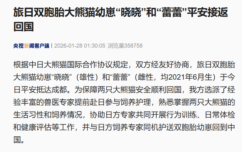 据央视新闻,根据中日大熊猫国际合作协议规定,双方经友好协商,旅日双胞胎大熊猫幼崽“晓晓”(雄性)和“蕾蕾”(雌性,均2021年6月生)于今日平安抵达成都。为保障两只大熊猫安全顺利回国,我方选派了经验丰富的兽医专家提前赴日参与饲养护理,熟悉掌握两只大熊猫的生活习性和饲养情况,协助日方专家共同开展行为训练、日常体检和健康评估等工作,并与日方饲养专家同机护送双胞胎幼崽回到中国。