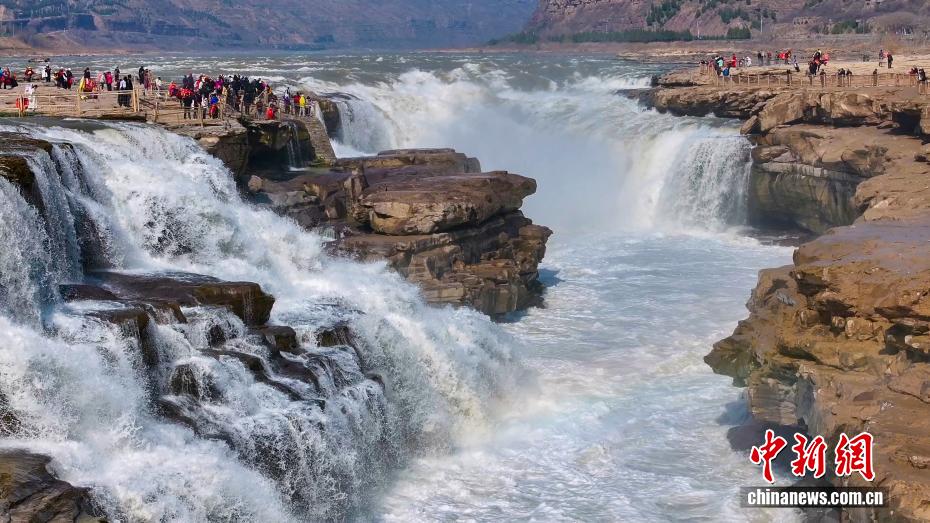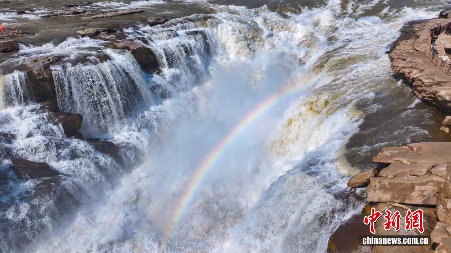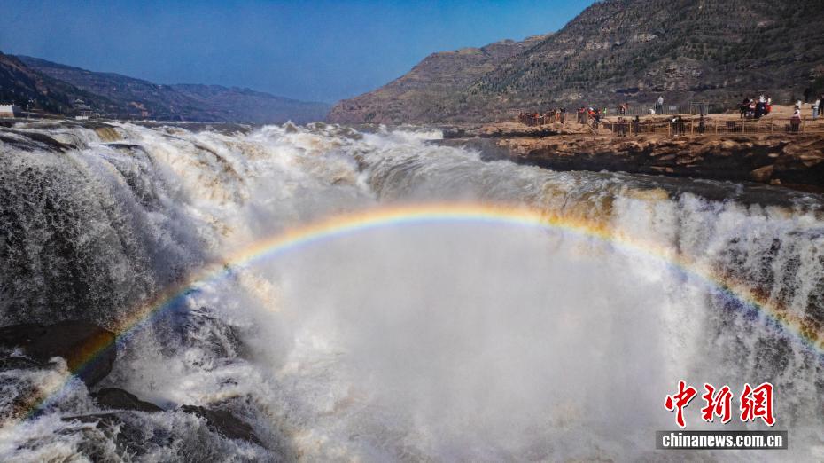 近日,气温回暖,春意渐浓,位于秦晋峡谷中段的黄河壶口瀑布,迎来了一年一度壮美绝伦的“桃花汛”景观。从空中俯瞰,滔滔黄河水裹挟着融冰奔涌向前,呼啸跌入龙槽,气势如虹,水雾漫天。阳光穿雾而过,架起一道绚丽彩虹,横跨瀑面,与奔涌不息的激流、岸边初绽的山桃花相映成趣,共同绘就一幅壮美的春日画卷,吸引众多游客驻足观赏。(记者:梅镱泷 宋洋波)