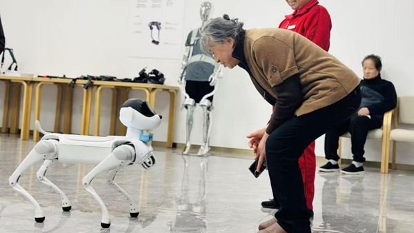 浙江乌镇智能养老中心内,院内老人正与机器狗互动。新华网发(钟月英 摄)