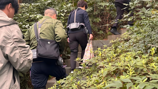 老人穿戴太希智能外骨骼机器人,轻松健步半山森林公园。新华网发