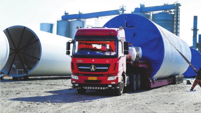 图为一车车新能源风电塔筒正在装车外运。