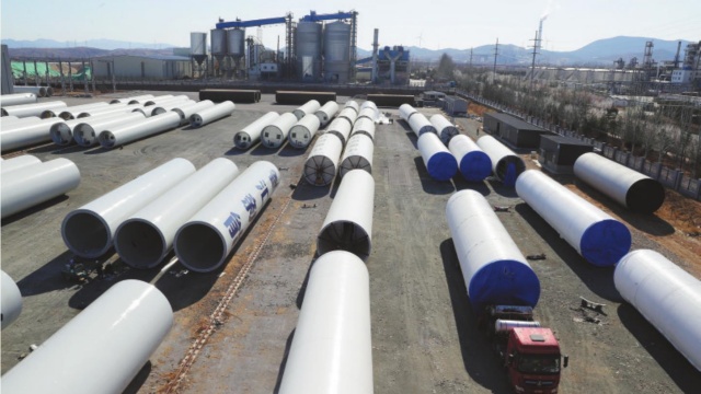 图为即将装运出厂的新能源风电塔筒。