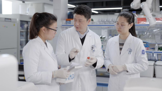 研究员胡海(左二)与团队成员交流。(中国科学院杭州医学研究所供图)