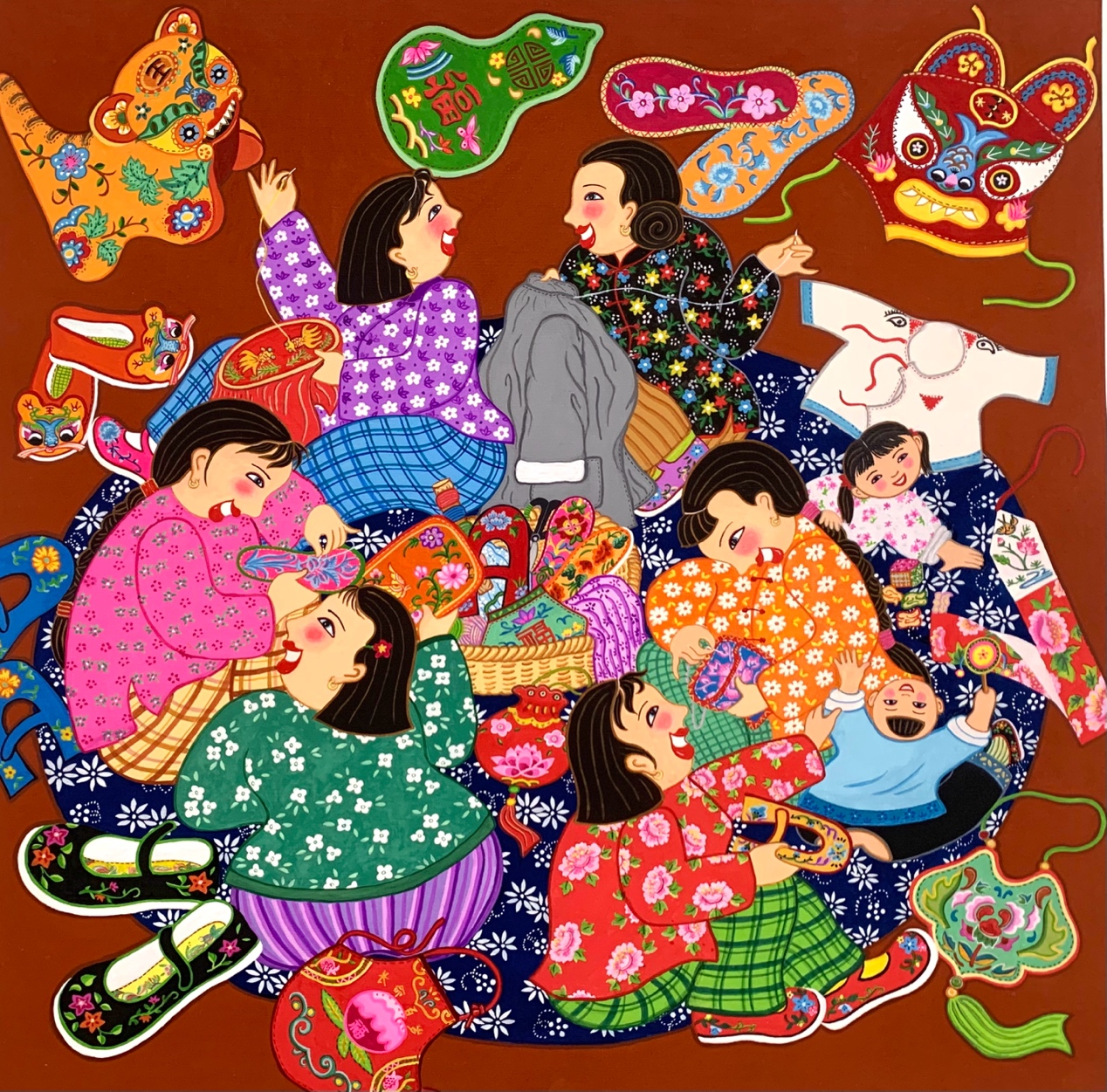 《织彩农家情》结构饱满,色彩鲜明。展现了农家妇女在农闲时节与春节前,以精湛的手工技艺为家人缝制衣物的场景,具有浓厚的东北乡韵。