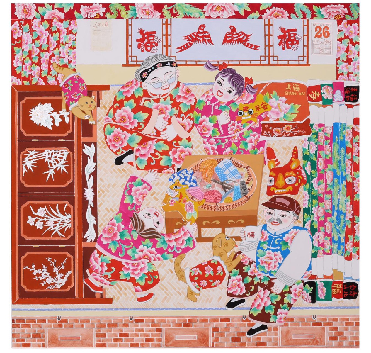 《年年岁岁事事红》生动还原东北满族的民俗场景,五颜六色的大花被、炕席、剪纸、老虎头鞋、舞龙道具等元素极具东北特色,展现了一家人其乐融融的场景。