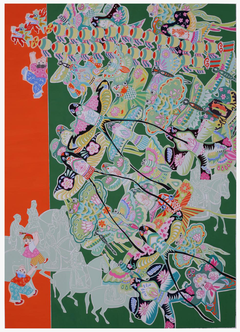 《青鸢载梦向春行》将山东胶南年画的套色印刷与手绘相结合,描绘少年借风筝托举理想,于春日奔赴未来的画面。
