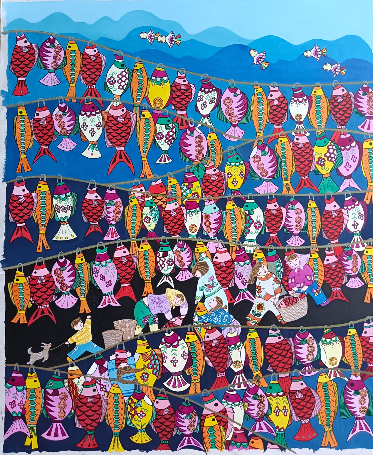 这幅作品采用平面画法,色彩艳丽丰富,人物生动夸张。一筐筐渔货被抬上沙滩,竹篓在沙地上晒出一片五彩的希望。