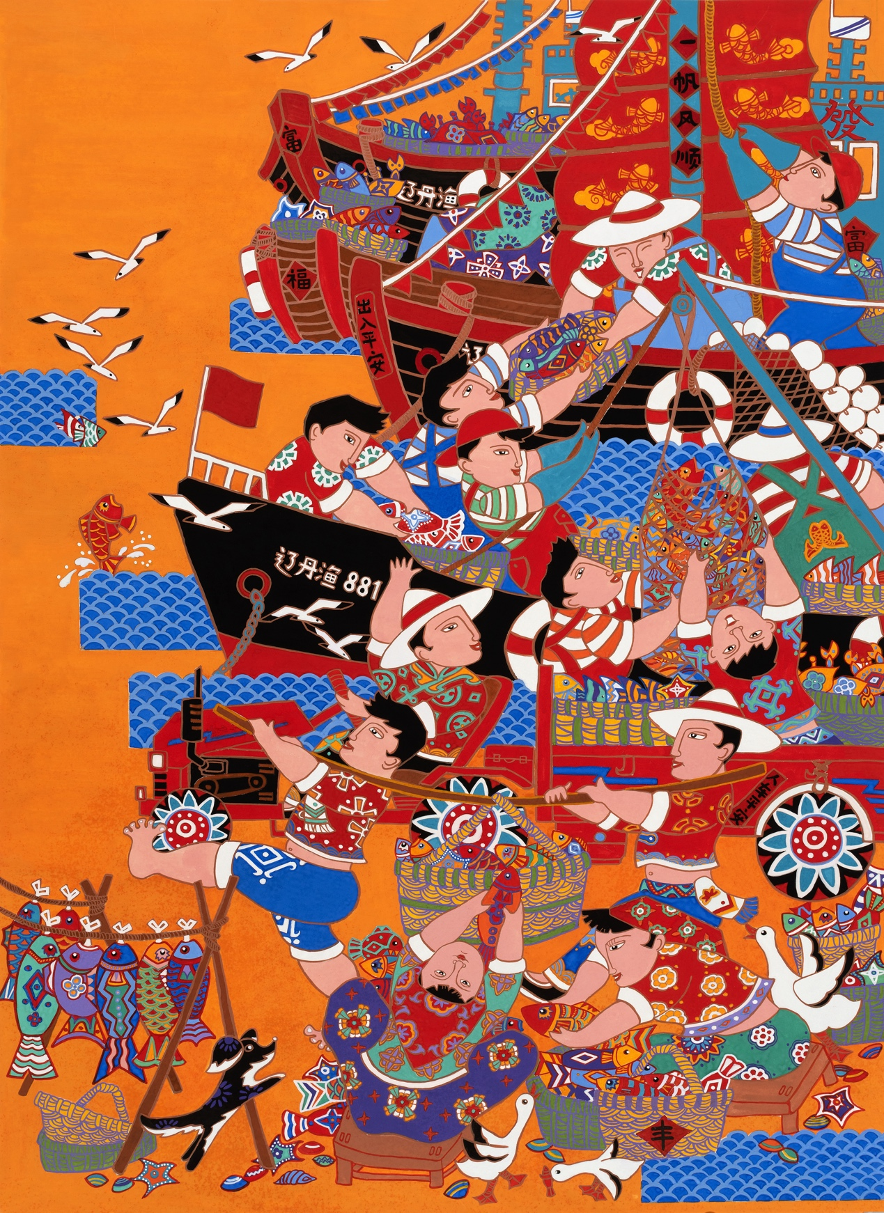 《渔港欢歌》表现清晨码头丰收的盛景,人物线条粗犷豪放,色彩明艳浓烈,大胆随心,充分体现辽东新农民的奔放和爽朗。