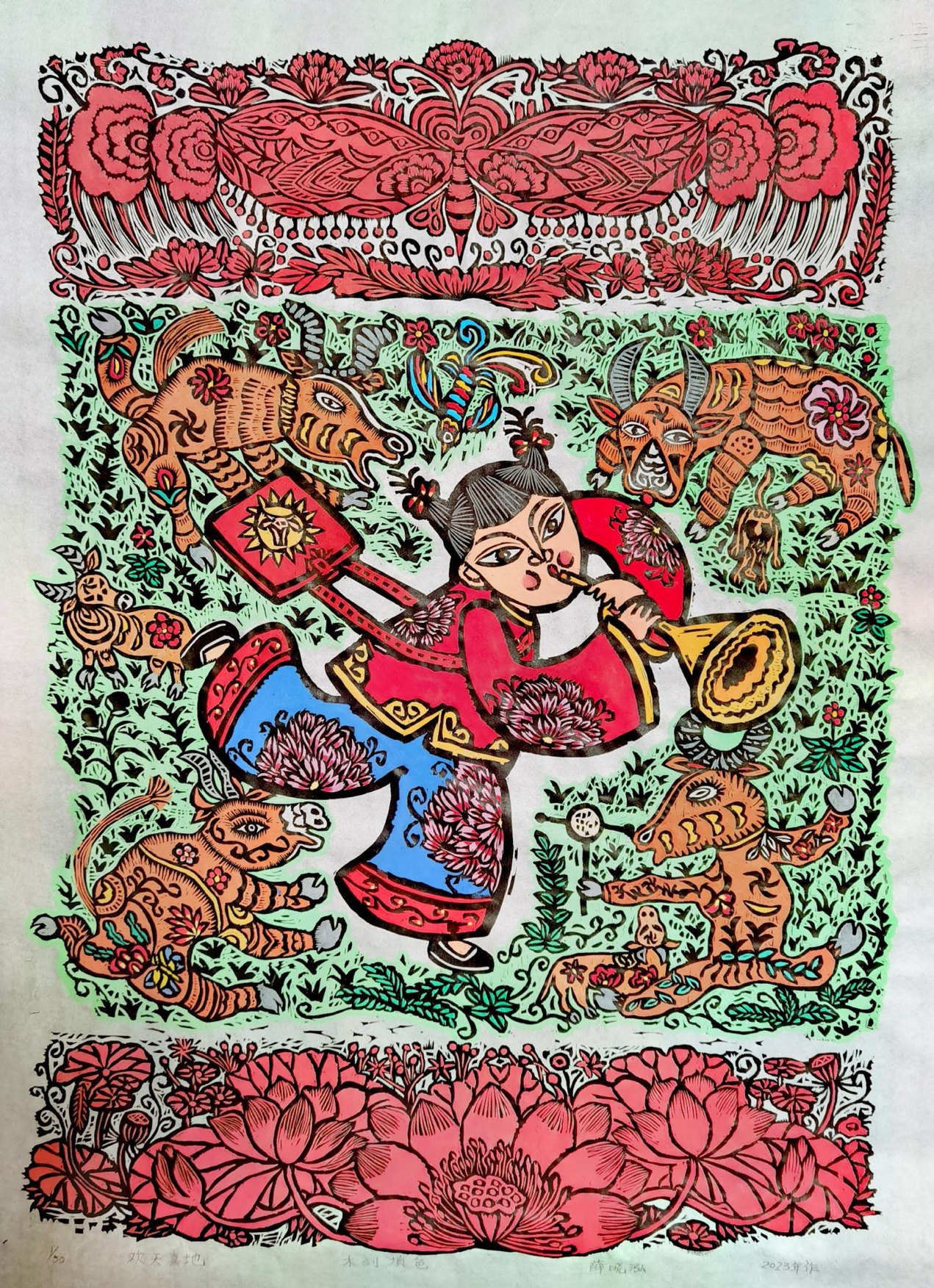 《欢天喜地》是一幅木版年画,表现一个小女孩在草长莺飞的春天里,欢天喜地吹着唢呐放牛的内容,生动展现传统文化与自然生命力的交融。