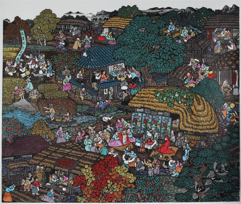 《和合图》是一幅桓仁版画,全面展现东北朝鲜族的生活场景与民俗风俗,表达只有人与人之间的和合、家庭之和合,才会有国家的和合的主题。