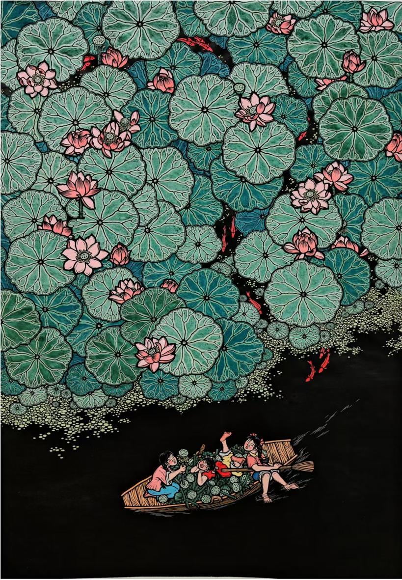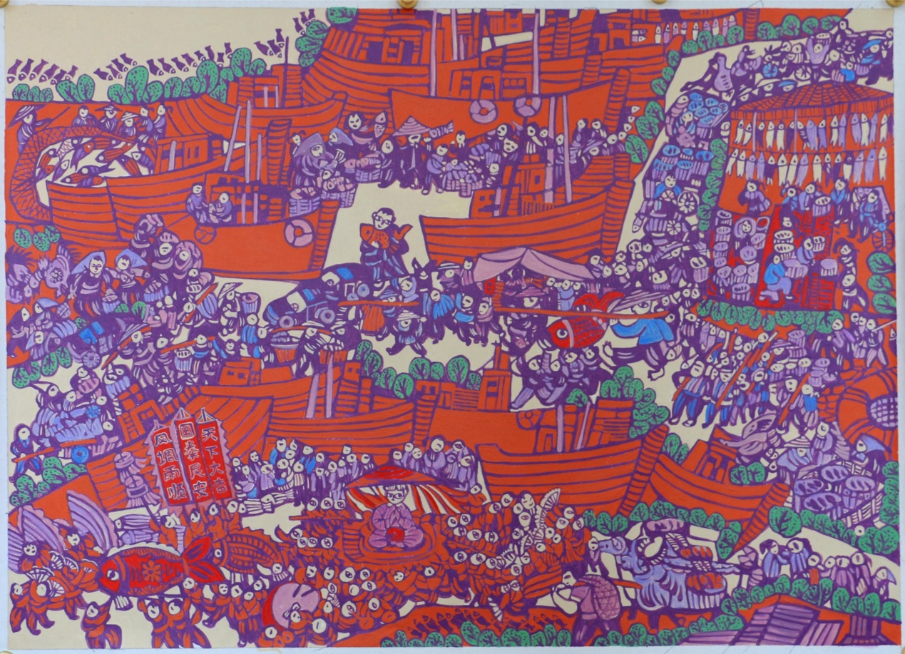 《和畅》是一幅木刻填色年画,表达畅通无阻、心情愉悦、以和为美的主题。以上满下空的构图方式,形成了聚散有秩的灵动对比,画面荷的静与人、船、鱼的动巧妙的对比生动有趣,呈现收获、喜悦、畅游的和谐氛围。