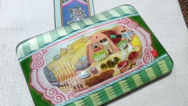 “我们把炕围画的腰线运用到茶杯上,很有装饰性;带有炕围画图案的瓷砖,也更好地呈现了它的美感。”金晓琴介绍,炕围画文创产品已走入机场、景区等场所,为更多人所了解。