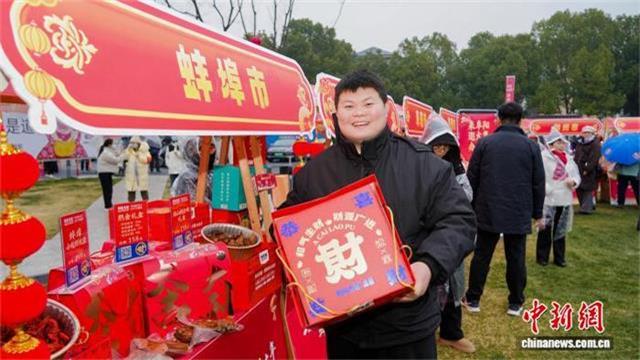 1月25日,来自蚌埠的商户在展示自己的产品。
