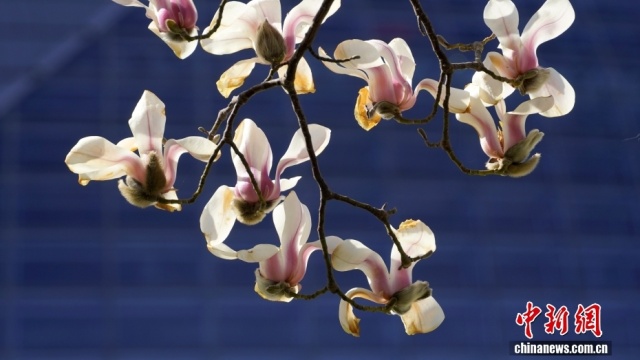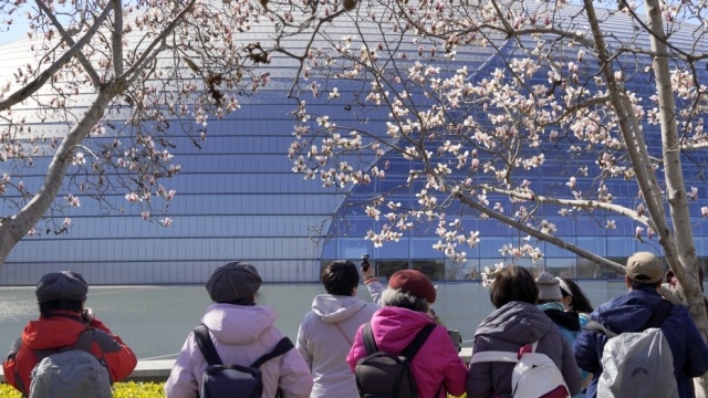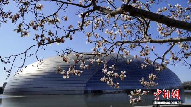 3月11日,北京国家大剧院旁的白玉兰竞相绽放,迎来最佳观赏期,吸引众多市民游客前来赏花拍照。