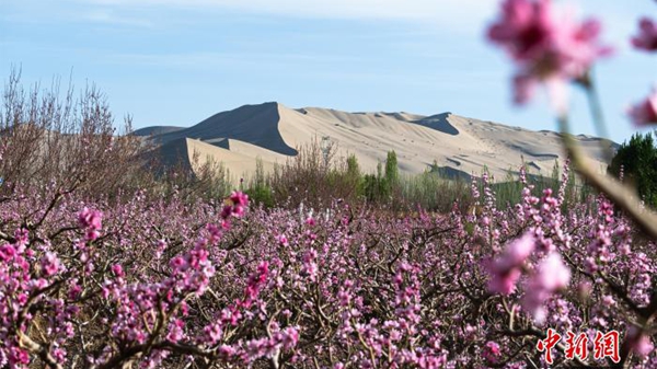 4月8日,敦煌鸣沙山下桃花盛开成花海。王斌银 摄