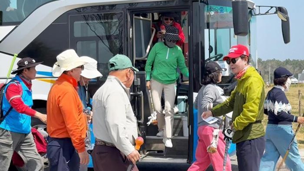 4月14日,山东威海,装备齐全的韩国游客走下旅游大巴,奔赴健步球场地。中新社记者 王娇妮 摄