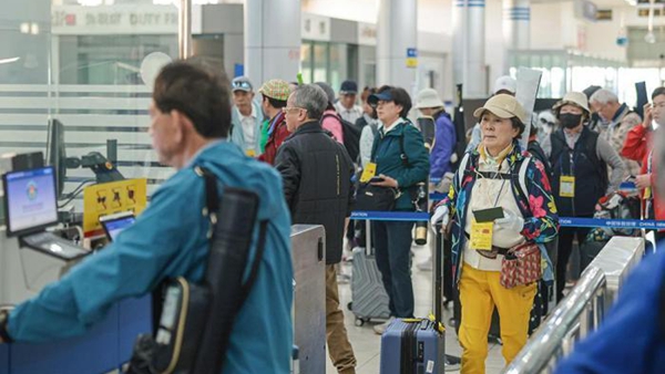 4月14日,山东威海石岛口岸,携带健步球装备的韩国游客在办理通关手续。李信君 摄