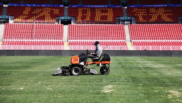 内场改造拆除了田径跑道,升级为沈阳承接专业级赛事的足球场。“为适应辽宁寒冷气候,场上我们铺设的是带加热的恒温地暖草坪。”作为专业赛事足球场,草坪的品质至关重要。体育场内7900平方米的草坪,选用早熟禾加高羊茅混播,地下装置了加热和智能喷淋系统,以加强养护。不远处,工人驾驶着一台草坪修剪机反复往返,进行修剪等操作。