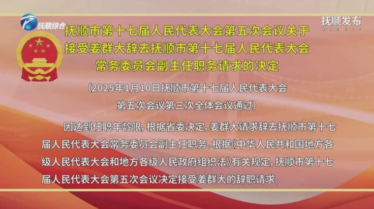 抚顺市第十七届人民代表大会第五次会议关于接受姜群大辞去抚顺市第十七届人民代表大会常务委员会