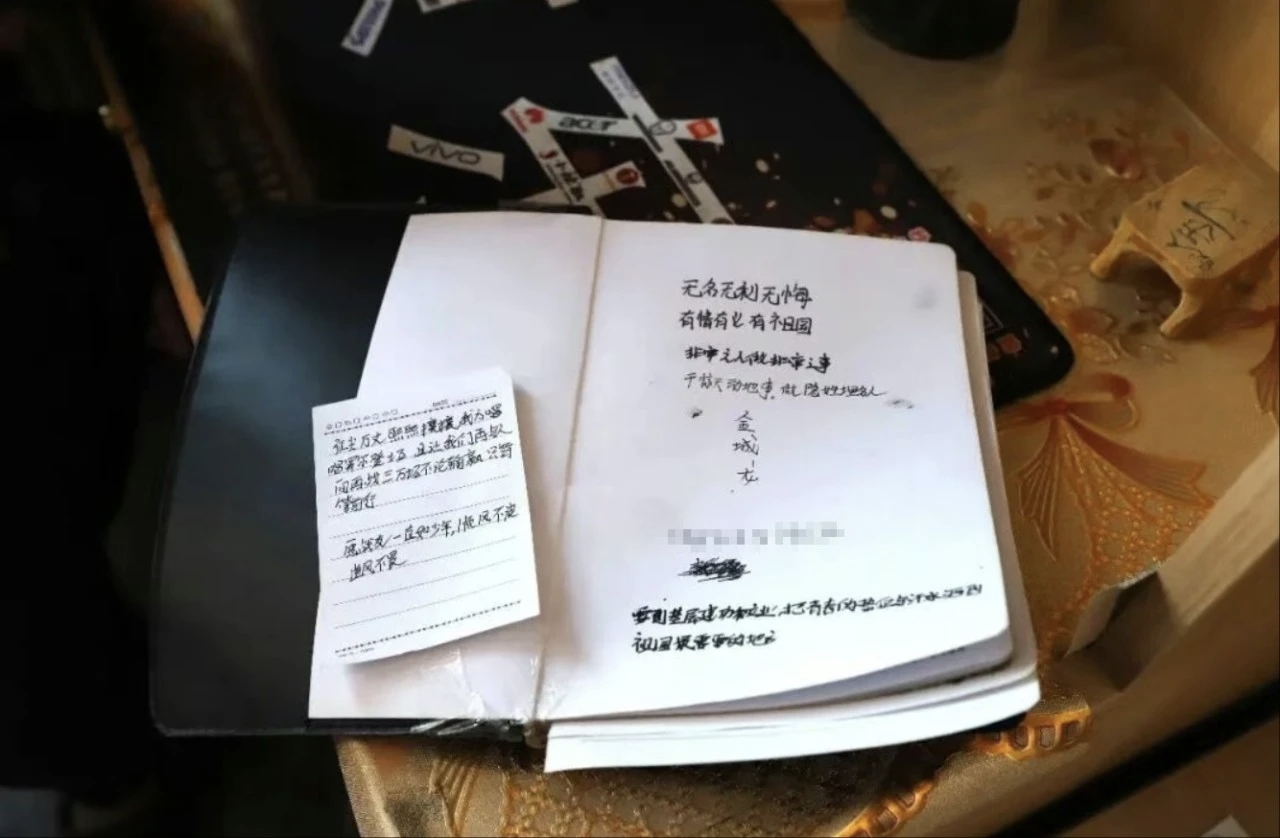 翻开金城龙的笔记本,首页上,“无名无利无悔 有情有义有祖国”“要到基层建功立业,把青春的热血与汗水洒到祖国最需要的地方”等内容赫然入目。