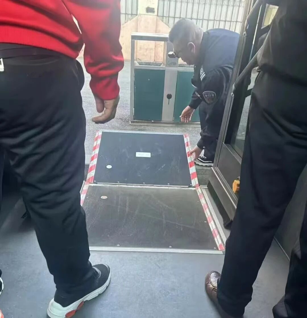 车辆停靠站点,一位老大爷推着坐在轮椅上的老伴准备下车。就在此时,公交车司机急忙主动起身,他熟练地打开了车辆的伸缩踏板,然后稳稳地扶住轮椅,一路护送老人下车。